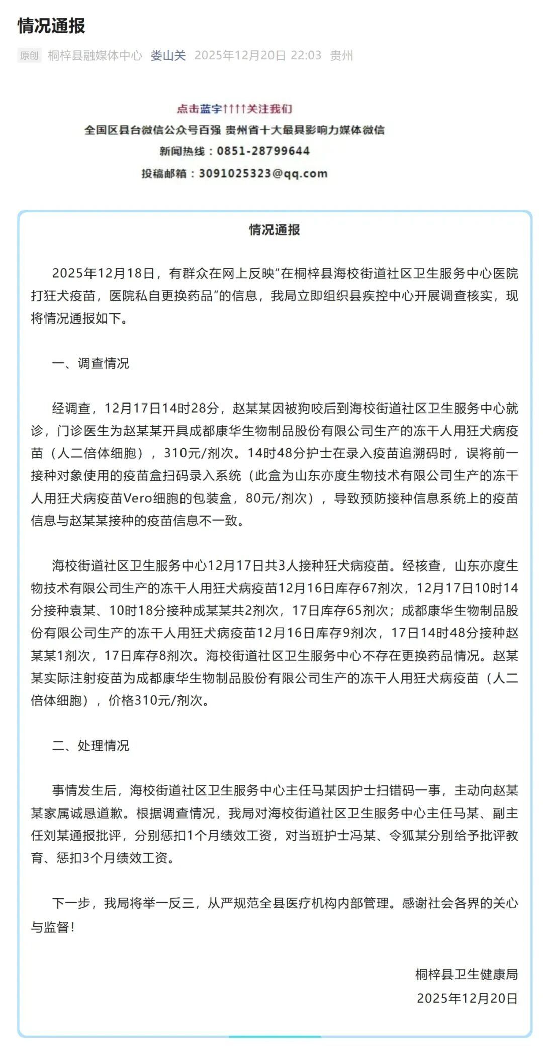 央广网遵义12月21日音讯(记者任振国)12月18日,有大众在网上反映“在桐梓县海校大街社区卫生服务中心医院打狂犬疫苗,医院私自替换药品”的信息。12月20日晚,贵州省桐梓县卫生健康局发布状况通报称,经查询,系护理在录入疫苗追溯码时,误将前一接种目标运用的疫苗盒扫码录入体系,导致预防接种信息体系上的疫苗信息与接种人接种的疫苗信息不一致。 2025年12月18日,有大众在网上反映“在桐梓县海校大街社区卫生服务中心医院打狂犬疫苗,医院私自替换药品”的信息,我局当即安排县疾控中心展开查询核实,现将状况通报如下。 经查询,12月17日14时28分,赵某某因被狗咬后到海校大街社区卫生服务中心就诊,门诊医生为赵某某开具成都康华生物制品股份有限公司出产的冻干人用狂犬病疫苗(人二倍体细胞),310元/剂次。14时48分护理在录入疫苗追溯码时,误将前一接种目标运用的疫苗盒扫码录入体系(此盒为山东亦度生物技术有限公司出产的冻干人用狂犬病疫苗Vero细胞的包装盒,80元/剂次),导致预防接种信息体系上的疫苗信息与赵某某接种的疫苗信息不一致。 海校大街社区卫生服务中心12月17日共3人接种狂犬病疫苗。经核对,山东亦度生物技术有限公司出产的冻干人用狂犬病疫苗12月16日库存67剂次,12月17日10时14分接种袁某、10时18分接种成某某共2剂次,17日库存65剂次;成都康华生物制品股份有限公司出产的冻干人用狂犬病疫苗12月16日库存9剂次,17日14时48分接种赵某某1剂次,17日库存8剂次。海校大街社区卫生服务中心不存在替换药品状况。赵某某实践打针疫苗为成都康华生物制品股份有限公司出产的冻干人用狂犬病疫苗(人二倍体细胞),价格310元/剂次。 工作发生后,海校大街社区卫生服务中心主任马某因护理扫错码一事,主意向赵某某家族诚实抱歉。依据查询状况,我局对海校大街社区卫生服务中心主任马某、副主任刘某通报批判,别离惩扣1个月绩效薪酬,对当班护理冯某、令狐某别离给予批判教育、惩扣3个月绩效薪酬。 下一步,我局将触类旁通,从严标准全县医疗机构内部管理。感谢社会各界的关怀与监督! 针对12月18日有大众在网上反映“在桐梓县海校大街社区卫生服务中心医院打狂犬疫苗,医院私自替换药品”的信息,12月20日晚,贵州省遵义市桐梓县卫生健康局发布状况通报。